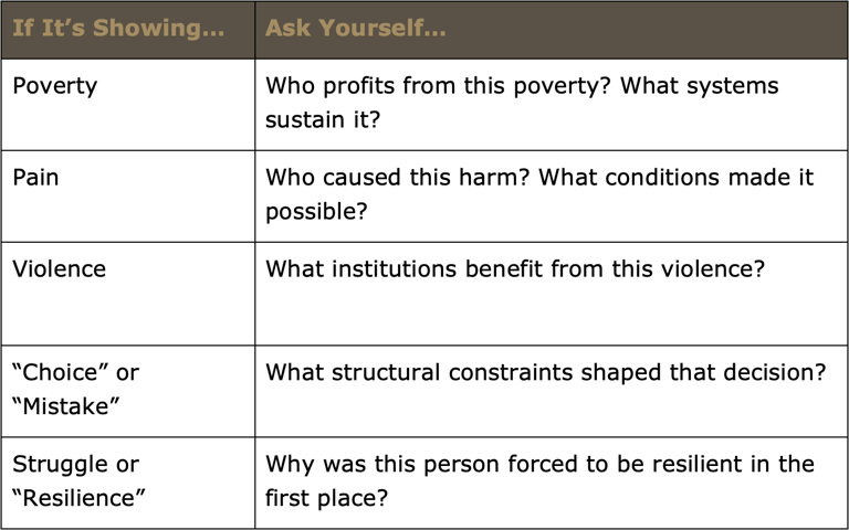 It is both a call-out and a useful tool – a framework designed for anyone tired of storytelling that looks politically conscious but refuses to do the political work.